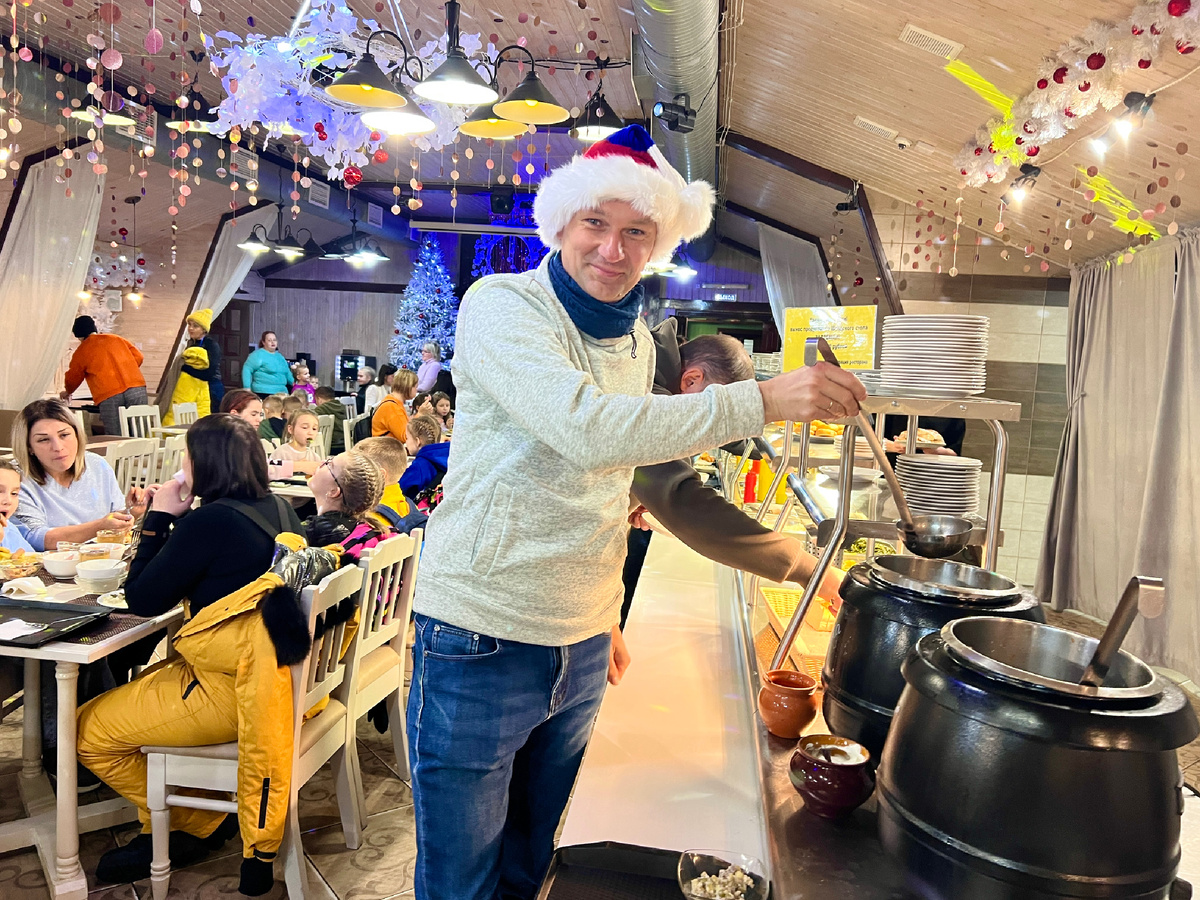 На входе встречает приветственный плакат от шеф-повара Руслана Галузо - главного повара Деда Мороза. И это вселяет надежду, что перед нами заведение, где кормят вкусно.