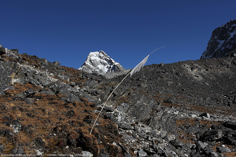 На фото ниже виден плавный подход к перевалу. Пока ещё просто пологий склон на подходе к Cho La Pass. Горняшка, слабость и одышка, острые камни вблизи и прекрасные заснеженные вершины Гималаев вокруг. Очередной раз замечаем, что горы похожи на актёров в театре, которые, взявшись за руки, вышли раскланяться к публике. Для масштаба на фото ниже «публика» — Игорь и наш гид Сергей Гутиев.