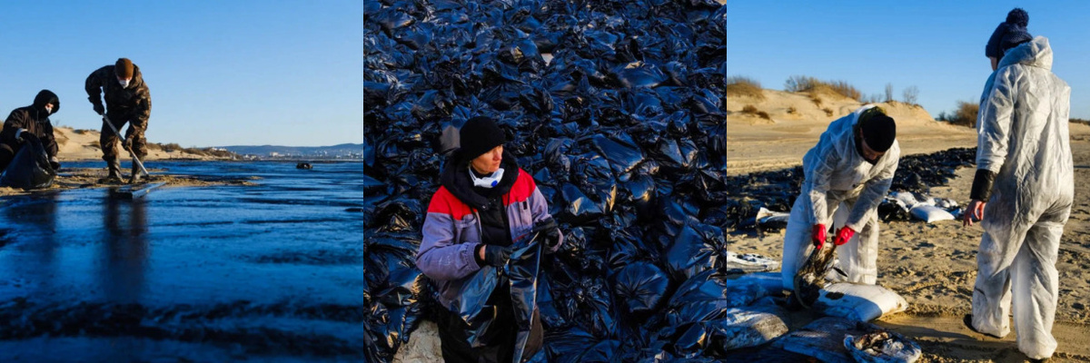 На данный момент, 90% убранных пляжей Анапы - заслуга волонтеров, которые не жалея здоровья, работают там и днем и ночью с первого дня после катастрофы! Многие из них зачастую без средств защиты. Но к сожалению, в большинстве своем, этот труд напрасен, поскольку собранный мазут в мешках некому, не на чем и не куда вывозить! Край не выделяет достаточного количества техники! Разъедая мешки и пакеты, мазут вытекает и просачивается снова в песок. Более того, невывезенные мешки обратно смывает в море штормом!