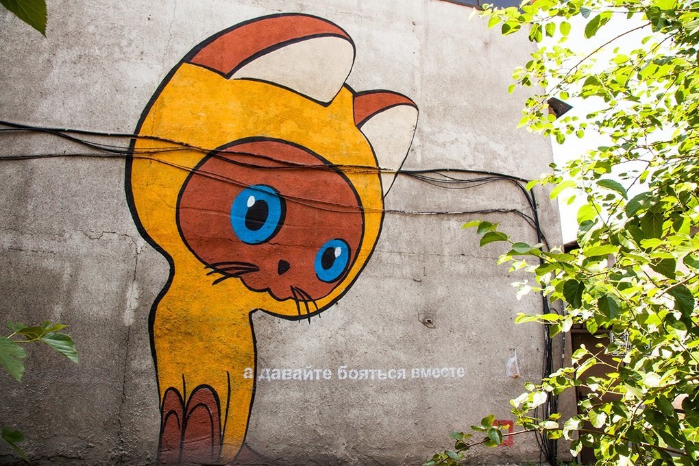 Эта впечатляющая работа, появившаяся в 2017 году, принадлежит уличному художнику Паше Касу. На ней изображен персонаж из знаменитого советского мультфильма — котенок по имени Гав. Внизу вы можете увидеть цитату: «А давайте бояться вместе». Эта стрит-арт работа стала одной из самых узнаваемых в Алматы, и ей придаёт особую ценность социальная тема. Паша Кас говорит, что через этот мурал он обращается к людям, призывая их объединиться и поддерживать друг друга, несмотря на страхи и трудности.