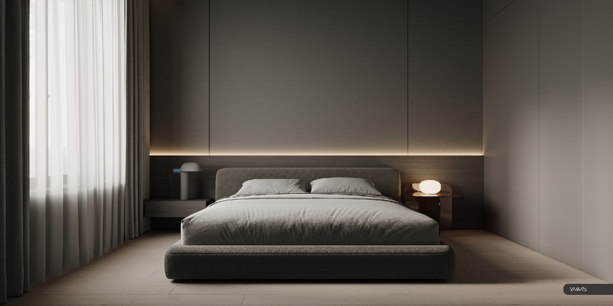 Далее находится спальня хозяина. Очень уютную атмосферу помещению придал темный полоток. По центру расположена кровать с мягким периметром. За ней изголовье кровати продлевается горизонтальной деревянной панелью из натурального шпона с подсветкой, а стена имитирует бетонные плиты так же как на кухне. С двух сторон от кровати спроектированы разноплановые функциональные тумбы, рядом встроенный до потолка шкаф выкрашенный в цвет стен. Особенной частью спальни стала стена напротив кровати, где часть является несущей. Было принято решение выдвинуть всю стену на один уровень и с помощью подсвечиваемых ниш за зеркалом скрыть её толщину. Полное описание проекта по ссылке: