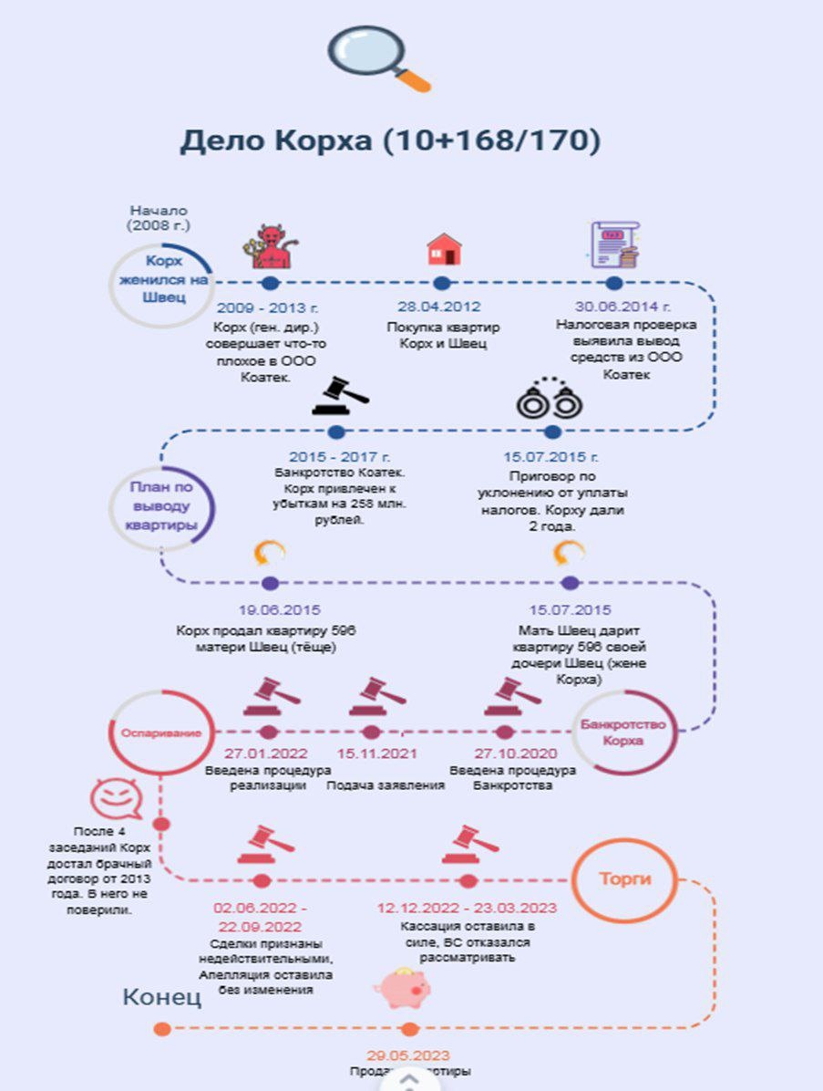 Кредиторы, получив какие-то копейки через исполнительные производства, подали на банкротство Корха. Через год вводят реструктуризацию долга, а потом реализацию или распродажу всего, что было лично у Корха. И тут начинается замечательная баталия за одну из квартир, которую Леонид Моисеевич решил припрятать и никому не отдавать. Суть в том, что у Леонида и его супруги ещё с 2012 было две квартиры. 596 – за Корхом и 597 – за Швец. Обе в Москве, по соседству. В 2014-2015 они поняли, что «дело табак» и переписали квартиру 596 в начале на мать Швец, через договор купли-продажи, а потом через дарение отправили её в собственность супруги. Итого, у Корха 0 квартир. У его супруги две. И все сделки совершены в далёком 2015 году.