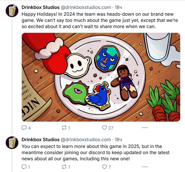 Канадский разработчик Drinkbox Studios, стоящий за Nobody Saves the World и серией Guacamelee!, готовится анонсировать свою новую игру. Во время своего поздравления с грядущими зимними праздниками студия отметила, что в 2024 году работала над своим следующим проектом. К сожалению, сейчас разработчик пока не готов раскрывать подробности о новой игре, несмотря на то, что очень хотят. Однако он пообещал сделать это когда-то в 2025 году. Да, студия не стала привязывать себя к какой-либо дате, а потому остается только гадать, будет ли анонс в начале или же в конце года. Последняя работа Drinkbox Studios был красочный ролевой экшен Nobody Saves the World, релиз которого состоялся почти три года назад. Последнее контентное обновление эта игра получила в январе 2023 года. Поэтому можно считать, что разработка новой игры началась с этого момента. https://www.youtube.com/watch?v=H_E1RhtzDHM