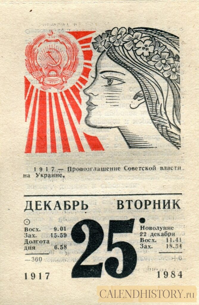 Итак, сегодня 25-го декабря и у нас на календаре 1984-й год. Перед нами листок советского календаря для женщин за этот день. На календаре у нас вторник - 25 декабря 1984-го года. 1917 — Провозглашение Советской власти на Украине. *** Оборотную сторону листка этого календаря можно посмотреть у нас по ссылке на сайте. Другие листки советских календарей смотрите у нас на сайте - CALENDHISTORY.ru ДРУГИЕ ЛИСТКИ ОТРЫВНЫХ КАЛЕНДАРЕЙ: