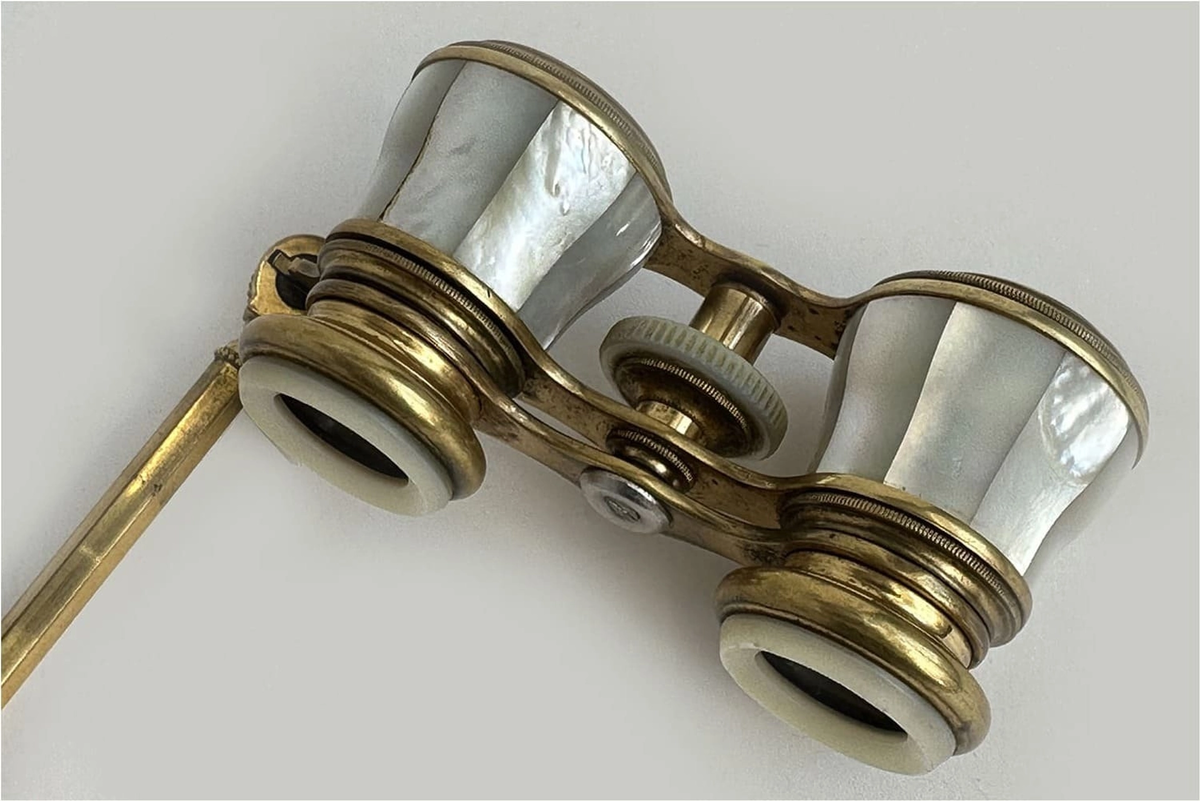 Этот шикарный театральный бинокль инкрустирован натуральным перламутром, а также оснащен телескопической ручкой. Бинокли такого типа начали выпускать во Франции в XIX веке. Они получили название «бинокли-лорнеты» и быстро обрели популярность (особенно у дам). Ручка не только была удобна, но и добавила стильности – прибор стал более изящным.