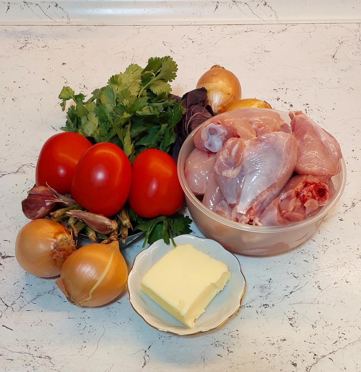 До нового года осталось шесть дней и в лентах исключительно закуски и салаты. Ну а я, хочу есть не только в новогоднюю ночь, по этому у меня чахохбили. Предистория: заходя в магазин, я подумала, что давно не готовила это блюдо но, представив как я мучаюсь с разделкой курицы, мне сразу его перехотелось. И вот, прихожу я в Куриный отдел, а там, лежат упаковки с кусочками для чохохбили. Мой шок в шоке но судьба уже все решила. А пока я шла домой, я вообще поняла, что рецептиком то я и не делилась. Исправляюсь и делюсь) Вариантов приготовления много, я поделюсь своим. Для рецепта нам понадобиться: Курица примерно 1 кг Томаты примерно 5 средних шт Лук репчатый. У меня 4 не крупных луковки. Чеснок 4-5 зубчиков Кинза 1 пучек, базилик 1-2 веточки петрушка пол пучка. Сливочное масло 50 гр Специи по вкусу. Сначала я подготовлю все продукты. Лук очищаем и нарезаем на четверть кольца. Чеснок очищаю и нарезаю на мелкие кубики. Зелень промываю и тоже нарезаю. Томаты промываю и делаю не глубокие