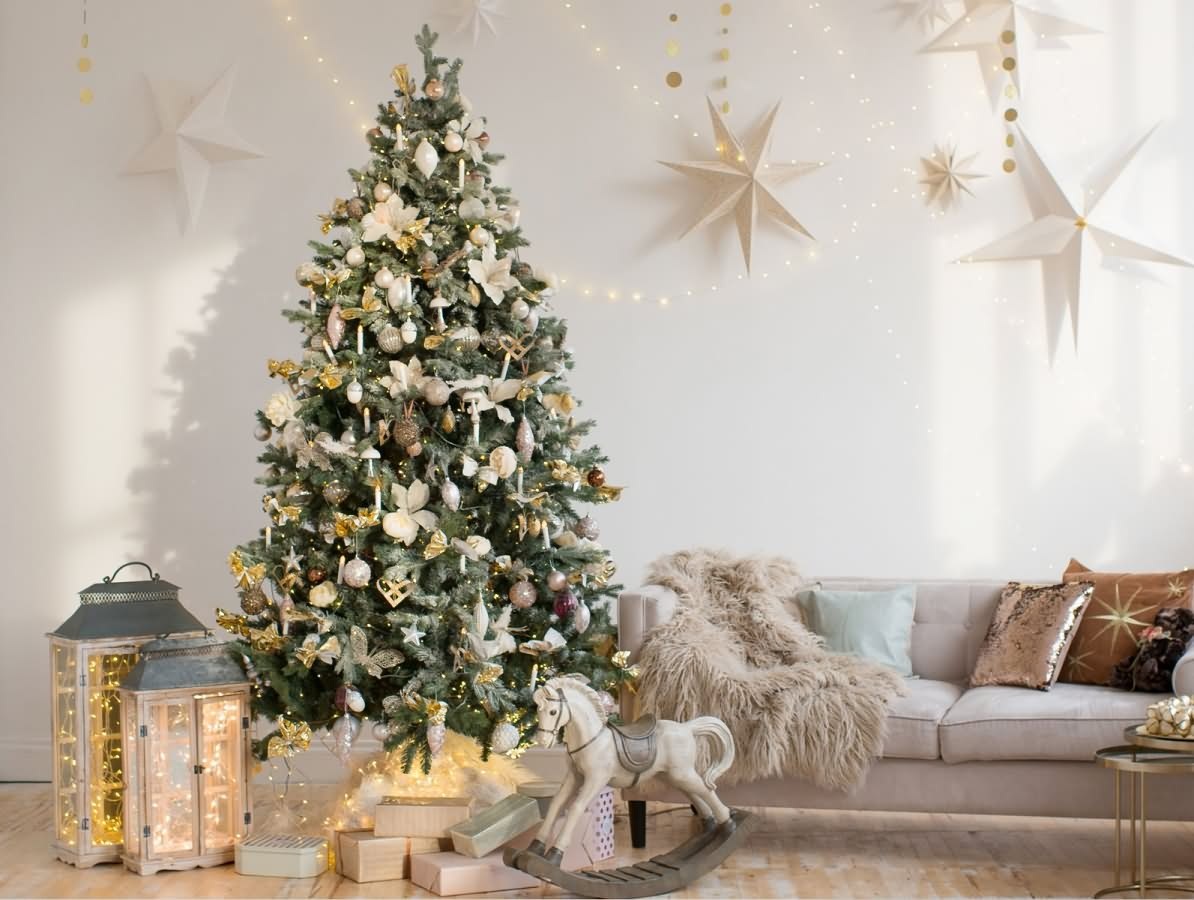 Ель в светлых оттенках создаёт атмосферу лёгкости и свежести. Этот стиль подойдёт минималистичному или современному интерьеру, добавляя ему нотку элегантности.
