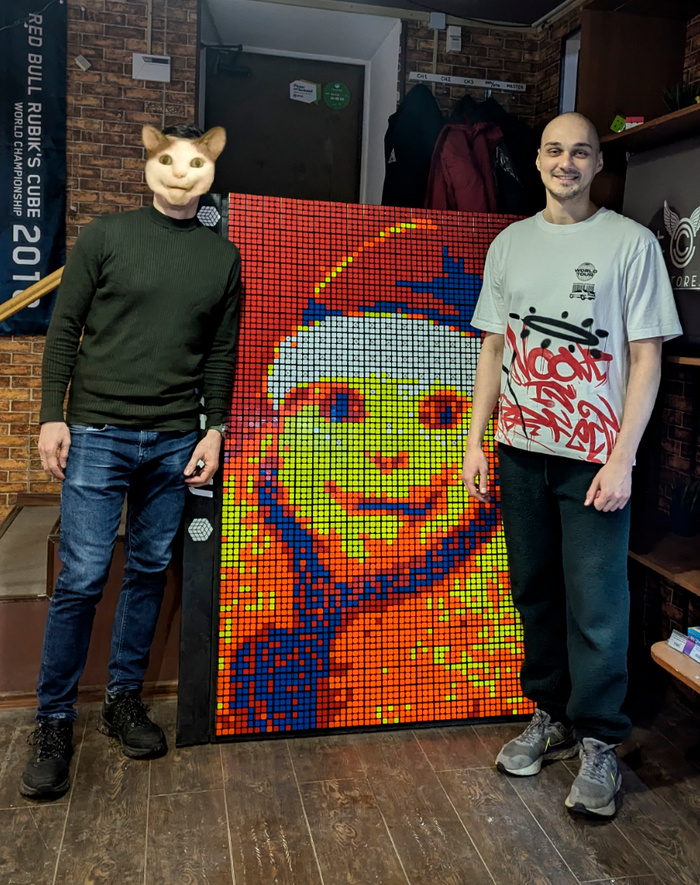 А теперь, небольшая история: По условиям конкурса нужно было зарегистрироваться заранее и выбрать свободную дату для сбора картины. На сбор произведения давался весь рабочий день шоу-рума с 9 до 20 по будням. Все выходные уже были заняты, а воплотить задумку-то хотелось! Мы долго не могли определиться с датой, потому что обычно рабочий день у друга заканчивается примерно в 17-18 вечера, и в таком случае у нас было бы очень мало времени на сбор изображения - чуть больше часа. Но удача подвернулась и оказалось, что в среду он сможет освободиться на ЦЕЛЫЙ час пораньше. Мы тут же подали заявку, оригинально назвав команду "Бу!", как раз под стать не менее оригинальной картине. Если вы знакомы с мемом, то могли заметить, что кот почему-то сидит в шапке. А сидит он в ней не случайно, ведь, конкурс то новогодний!:) Однако, изначально планировали собирать того самого, без головного убора, и шапку для него мы выбрали в тот же вечер, в пути на мероприятие. Зайдя в шоурум нужно было разобрать прежнюю картину, сотрудница для этого дела любезно предоставила нам коробки, куда мы аккуратно закидывали старые кубики. Почему аккуратно? А потому, что если их просто кидать, то ударяясь о другой кубик их цветные грани отлетали и пропадали под толщей стихийно образовавшейся кубической мозаики. С разбором мы справились буквально за пару минут, но, ломать - не строить! Мы устроились поудобнее на стульях, сверились с планом сборки на телефонах, распределили, кто с какого угла собирает и стартанули! Куб за кубом, слой за слоем, полотно, словно тетрис, заполнялось все новыми элементами паззла, картина все больше обретала очертания и смысл. Время шло, спина затекала, мозги плавились от сотни другой собранных кубиков. Мы перекидывались шутками, короткими фразами, нервно хихикали от того, что можем не успеть. Я старался быть полностью сосредоточенным на сборке, а друг периодически подгонял меня - мол, что нужно ускоряться, давай-давай и все в таком духе. И тут мы понимаем, что остаётся буквально несколько рядов, а времени уже почти нет! Буквально 10 или 15 минут! Я глянул на схему сборки, на общую картину и сказал, что буду собирать красные, а ты их ставь, куда надо. Новое разделение труда образовалось в мгновение ока и я начал штамповать красные стороны с невероятной для меня скоростью и отставлял их в сторону, ведь, верх картины преимущественно состоял из них, а друг собирал другие и ещё ставил нужные на свои места! В это время мы просто сосредоточенно, напряжённо молчали и казалось, что было слышно только, как шуршит одежда, как скрипят и похрустывают механизмы головоломки, и как кулак вдалбливает куб, что не хочет влезать в картину, заканчивая ряд за рядом. На наше счастье под закрытие магазина начали заваливаться покупатели и я уж подумал, что "ага! Нас не выгонят, пока тут есть покупатель! Это играет нам на руку", но тут, незаметно для нас, последний человек вышел... Сотрудница начала чем-то шуршать, ходить и, спустя пару минут сказала, что мол ребята, всё - время вышло, магазин закрывается - и направилась в подсобку, а мы, как малые дети:Ну ещё 5 минуточек! Мы уже почти!" И ведь действительно оставалось совсем чуть-чуть, буквально 8 кубов. И тут мы ставим последний, встаём и восторгаемся. Мы успели - это наша личная победа! Мы быстро фотографируемся, понимаем, что собрали буквально за 2.5 часа, а с