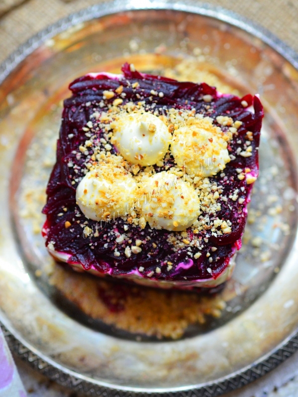 Звучит как полный абсурд, правда? Но, поверьте, результат получается такой, что язык проглотишь. Это тот случай, когда хочется сказать: «А что, так можно было?!» [будет что рассказать внукам и правнукам] 🛒 Что нам понадобится? 👩🍳 Как будем готовить? Шаг 1. Изюм заливаем горячей водой и оставляем на 5 минут. В это время нарезаем бананы аккуратными кубиками. Чеснок мелко рубим – не нужно мучить его в прессе, он и так раскроет свой вкус! Свёклу отвариваем в кожуре до мягкости, остужаем, очищаем и натираем на крупной тёрке. Шаг 2. Берём красивую форму (или просто глубокую тарелку) и начинаем создавать слои. Первым идёт натёртая свёкла. Смазываем её каплями майонеза – не размазываем! Пусть всё будет нежно и воздушно. Шаг 3. Следующий слой – смесь бананов, изюма и чеснока (можно их смешать предварительно или не смешивать). Это будет самый толстый слой, ведь именно он отвечает за яркость вкуса. Снова немного майонеза. Шаг 4. Закрываем конструкцию ещё одним слоем свёклы, распределяем крупн