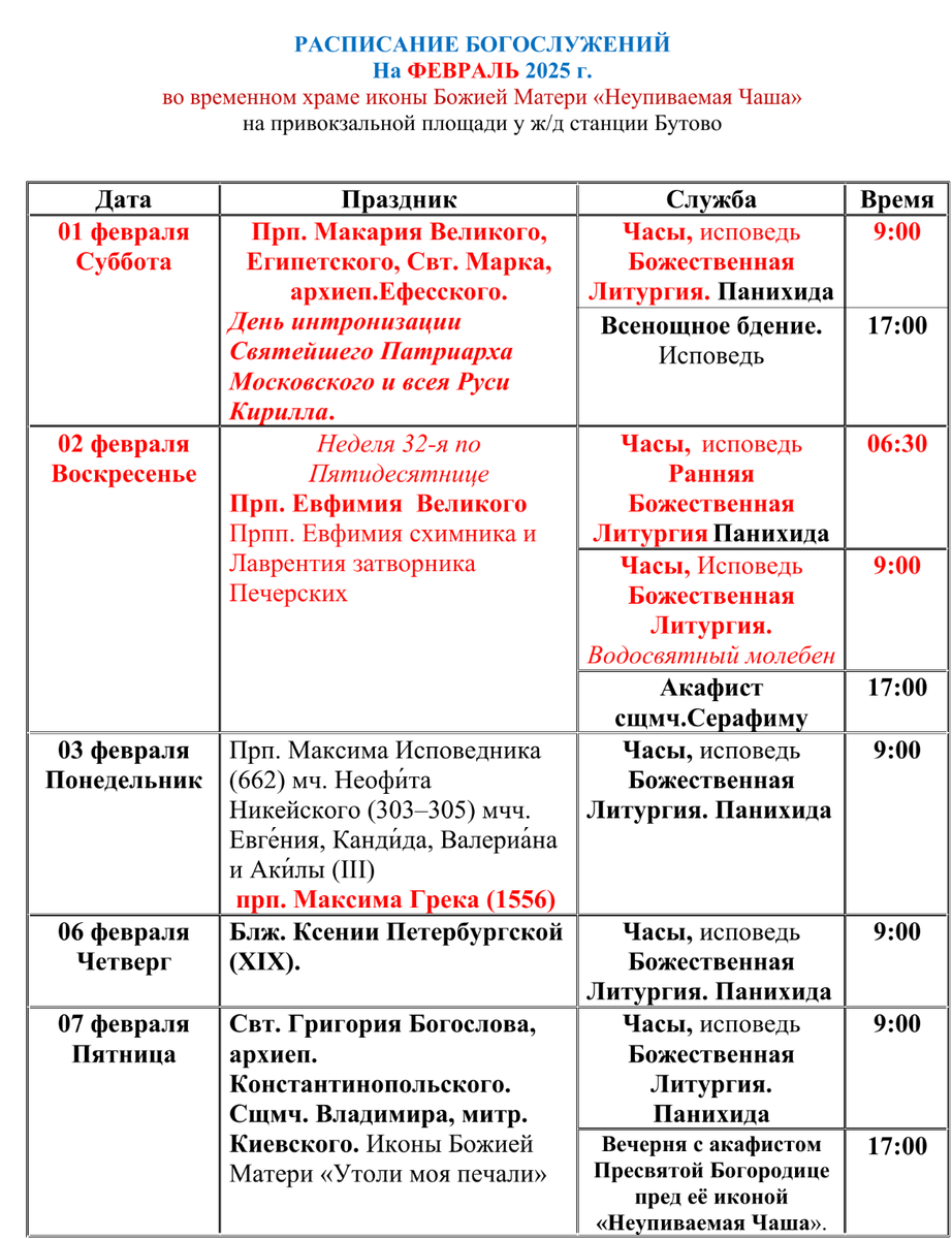 Расписание Богослужений ФЕВРАЛЬ 2025г. Храм Священномученика Серафима, Митрополита Петроградского в Южном Бутове.