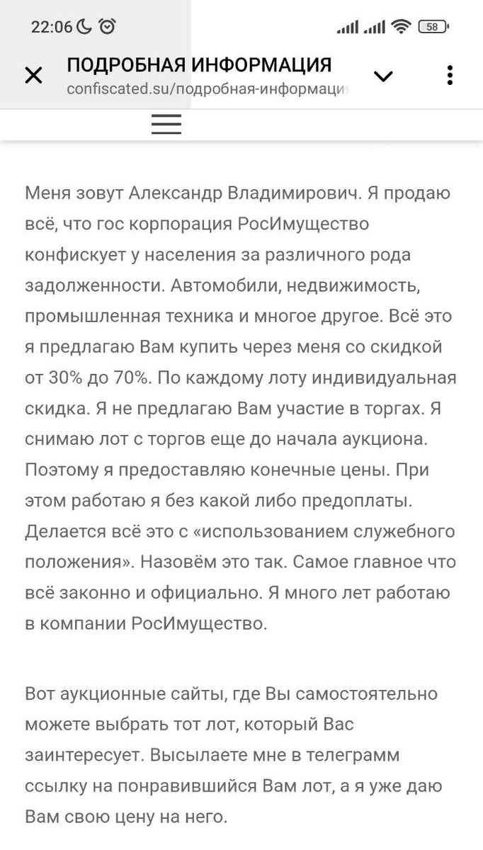 Интересная история по поводу одного лота️: БМВ 750Li xDrive (VIN) X4XKC81140DV56832. Начальная цена 1 143 263,00 рублей Пришел запрос на возможность осмотра авто, как всегда сразу оцениваем рентабельность покупки, примерную конечную стоимость. Цены меняются постоянно обычно смотрим на Авито или авто.ру. Каково же было удивление на Авито стоит этот автомобиль по цене 450 000 рублей, указано, что битый. Пишу продавцу - он предлагает перейти в тг для обсуждения деталей, нахожу его ТГ канал, а там шикарные предложения - цены ниже рынка и ссылка на сайт, захожу на сайт и о чудо - далее информация с сайта: Александр Владимирович, работает в Росимуществе и своим служебными связями может снять любой лот с торгов и отдать его вам за 30-70% от цены. Самое интересное, на сайте рассказывается, что открытые торги от закрытых отличаются тем, что открытые видят все, а закрытые только избранные в канале, но это не все: Росимущество при покупке машины бесплатно доставит ее вам до любой станции ж/д тр