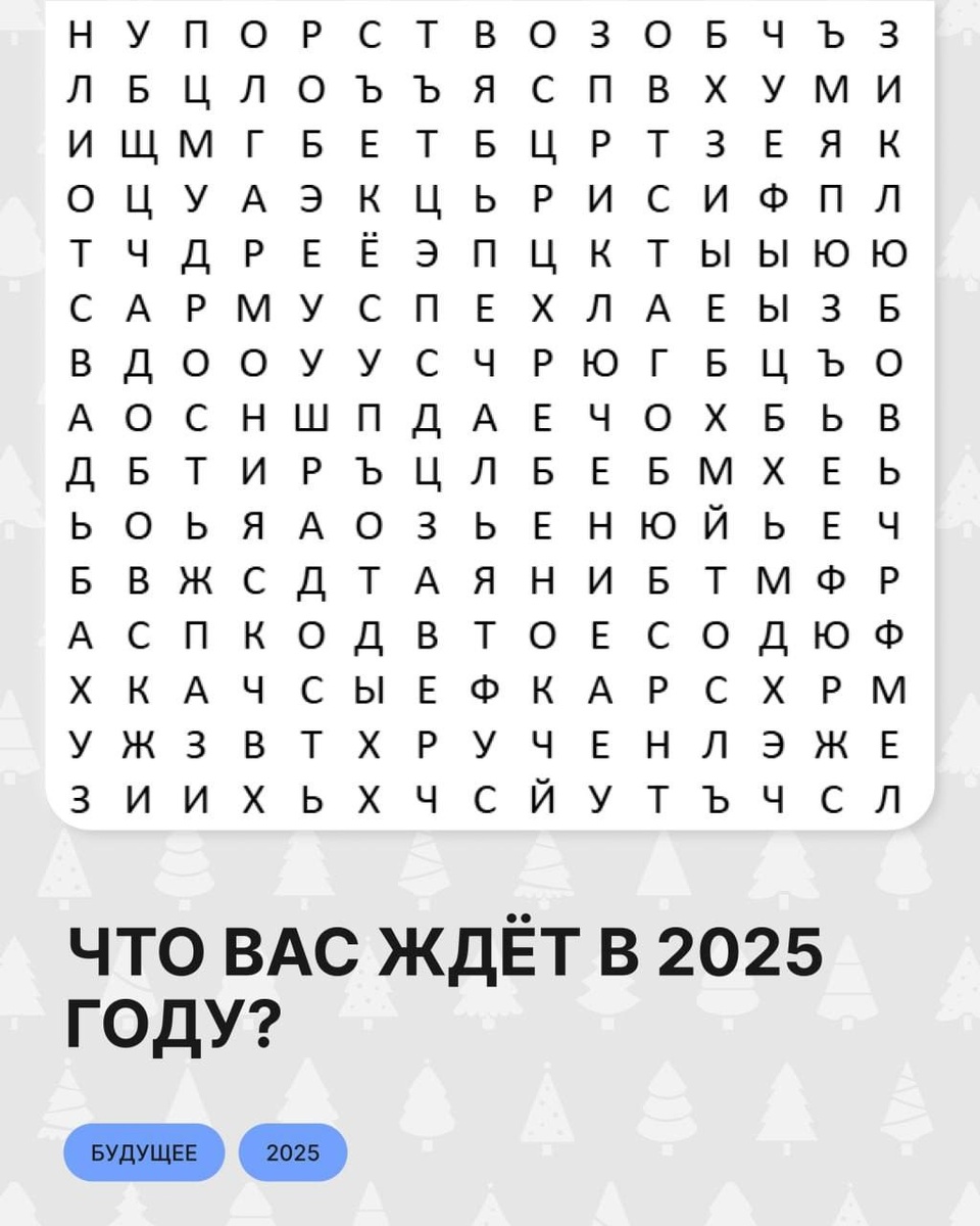 Не кажется ли, друзья, что мы как-то слишком серьезно. Да, обстановка как-то к шуткам не располагает. Но скоро все-таки Новый Год. Короче, вот волшебный филворд, который должен предсказать, какой у вас будет Новый Год. Вы должны найти три слова, которые и определят ваше будущее на 2025-й год. У меня получилось: «Упорство, гармония, радость» Короче, если я в следующем году проявлю упорству, то в моей жизни меня ждет гармония и радость. Ну что ж, не самое плохое предсказание. Да будет так!