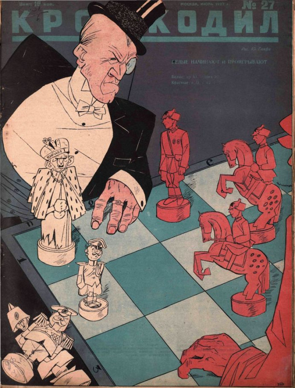1927 год. Карикатура на обложке журнала «Крокодил» на действия Англии и белоэмиграции против Советской России. «Белые начинают и проигрывают». На главной коронованной фигуре написано «Кирилл»