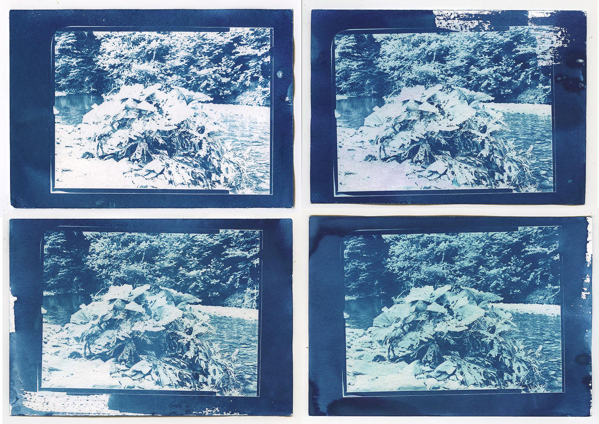 Проявка цианотипии в воде, уксусе, лимонной кислоте разных концентраций. Сравнительный тест