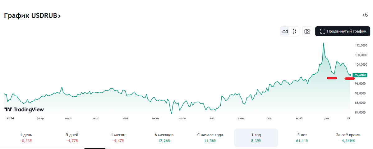 Это уже второй откат курса в район 100 рублей за доллар, первый наблюдался 9 декабря, всего 1 день, теперь он, наверное, будет чуть более длительным.