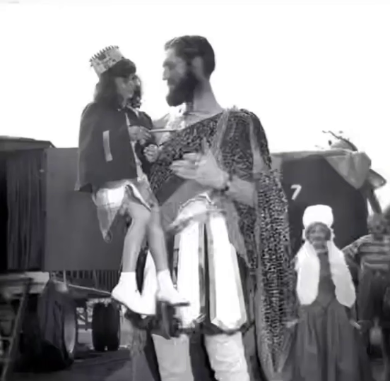 Он протягивает руку, словно поправляет лампу или держит её, демонстрируя огромный рост. На заднем плане виден другой человек, значительно меньший по размеру, что ещё больше подчёркивает масштаб гиганта