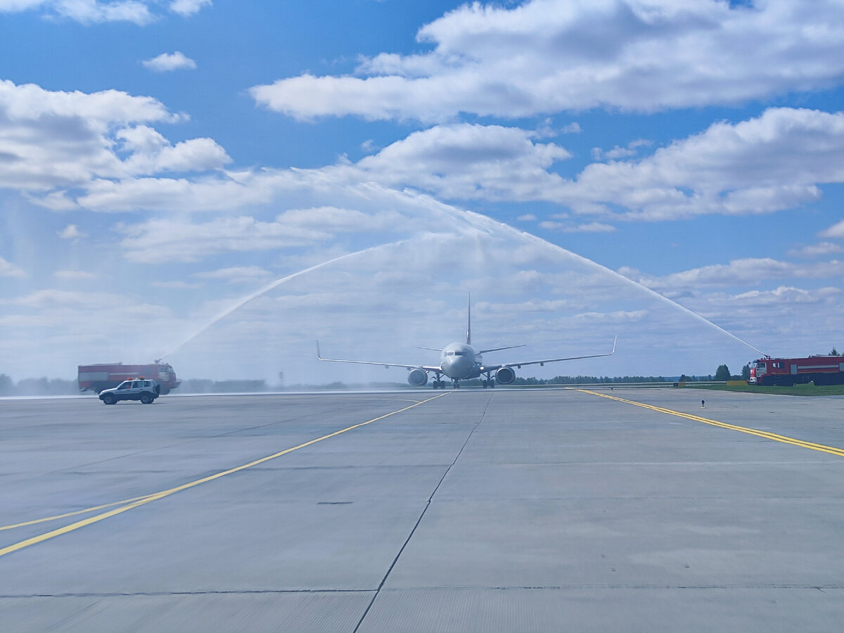 Во второй раз в жизни встречал самолет водной аркой. Эта традиция исполняется, когда новый рейс приходит в город. В первый раз это был маленький самолетик Wizz air, сейчас это были Nord Wind из Улан-Удэ. Прикол в том, что одновременно нужно было и снимать видео, и фотографировать.