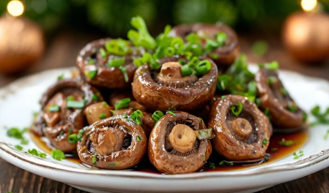 - Достаньте готовые шампиньоны из духовки и дайте им остыть до комнатной температуры. Затем переложите их в красивую тарелку, посыпьте мелко нарезанным зеленым луком и сбрызните остатками маринада перед подачей.
