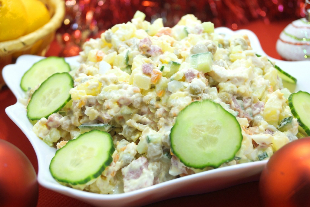 Нам понадобится: Куриное филе 200 г Копченая колбаса 100 г Консервированный зеленый горошек 100 г Картофель 2 шт Морковь 2 шт Яйца 3 шт Свежий огурец 1 шт Майонез Соль по вкусу Приготовление: В миску нарезать кубиками отварной картофель и морковь. Добавить нарезанные кубиками отварные яйца и свежий огурец. Куриное филе отварить до готовности и остудить. Добавить кубиками нарезанную колбасу и куриное филе. Добавить зеленый горошек и майонез. Хорошо перемешать и посолить по вкусу. Салат «Новогодний Оливье» готов. Выложить в салатницу и подавать к новогоднему столу.