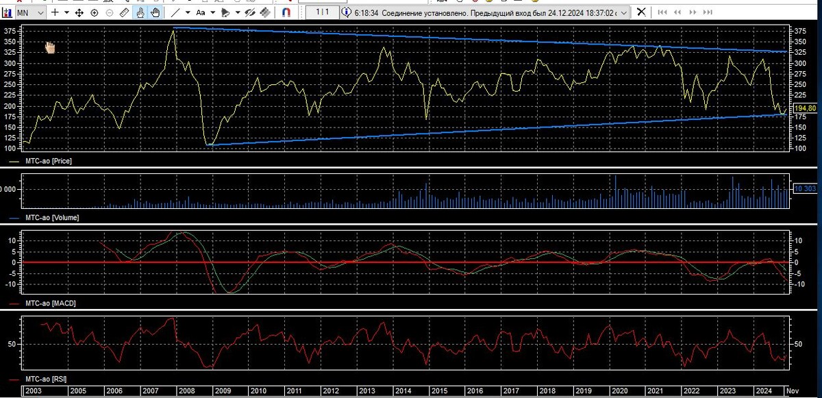 1. Новостной фон постепенно улучшается, Центральный банк РФ держит молчание насчет повышения ставки. Рубль расположился под уровнем 100, компания МТС сообщает, что экономический отчет за четвертый квартал за 2024 год, будет опубликован в январе 2025 года. Вопрос по дивидендам от компании не меняется, и Совет директоров весной будет утверждать дивиденды не ниже уровня выплат в 2024 году. До конца декабря акция удержится на линии поддержки тренда с настроением закрепиться на уровне 200. К середине января 2025 года, будет стараться выйти на уровень 222, к концу января взять курс на уровень 235-250.