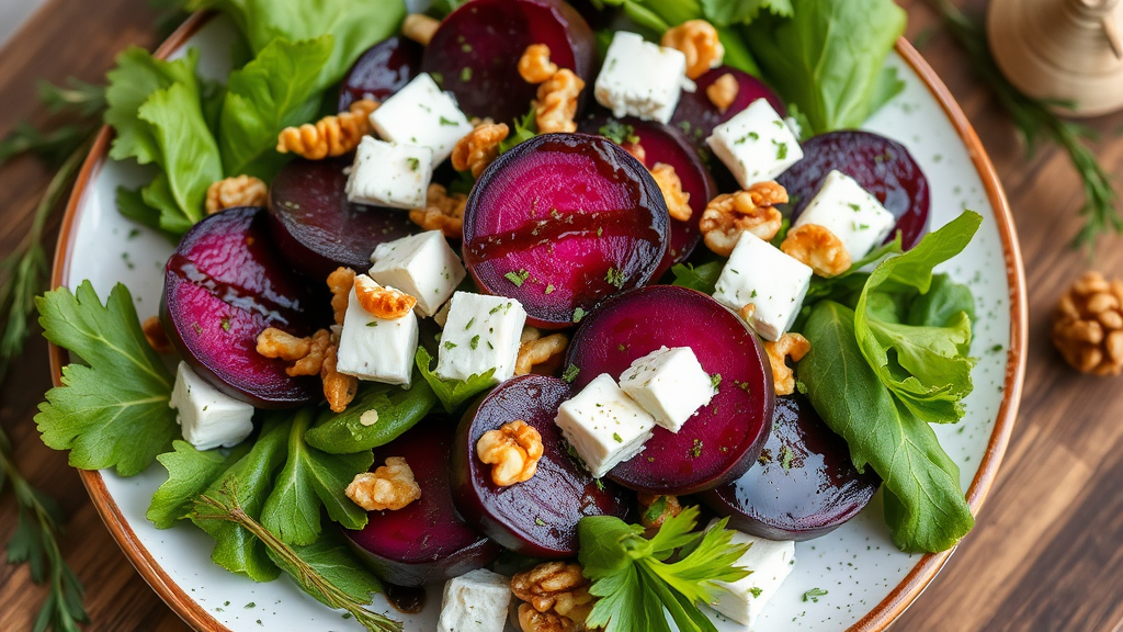 Съедят за минуту! Необыкновенно простой и вкусный салат из обычной свеклы Когда за окном солнце нежно золотит листья, а воздух пахнет свежестью и надеждой, самое время собраться с близкими и приготовить что-то особенное. Этот необыкновенно простой и вкусный салат из свеклы станет чудесным дополнением к вашему уютному вечернему застолью. Он не только насыщает, но и приносит радость, как и теплые воспоминания о счастливых моментах. Фиолетовый цвет свеклы напомнит о том, что даже простые ингредиенты могут восхитительно сочетаться, создавая атмосферу праздника. Ингредиенты Свекла — 400 г (лучше всего использовать местную, свежую свеклу) Фета — 100 г (можно заменить на козий сыр для более насыщенного вкуса) Орехи грецкие — 50 г (добавят хрусткость и ореховый нюанс) Оливковое масло — 3 ст. ложки (используйте холодного отжима) Бальзамический уксус — 1 ст. ложка (придаст пикантность) Соль и перец — по вкусу Зелень — для украшения (петрушка или базилик добавят свежести) Инструкции по приготовле