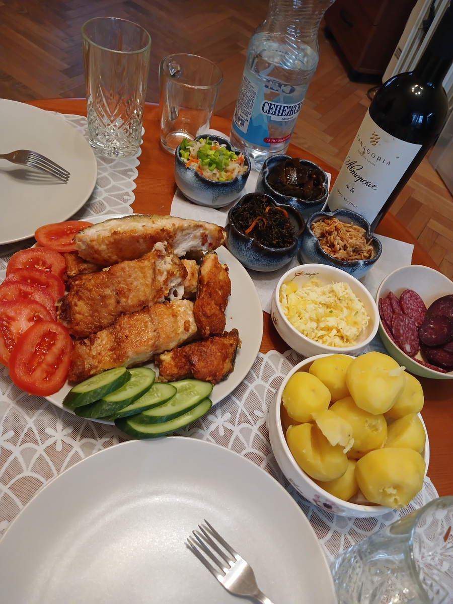 Здравствуйте, уважаемые мои подписчики и читатели Дзена! Вчера пришла утром со смены, поспала пару часов и принялась за приготовление праздничного обеда, который должен был плавно перейти в ужин. Но, тут написал Артём, что прийти не сможет, заболел, температура 37 и все симптомы вируса. Ну, что ж пусть сидит дома, нам разносносчики заразы в дом не нужны. Договорились, что выздоровеет и уже в январе приедет в Егорьевск) А так как у меня уже была разморожена кета и корейские салаты, и в гости я ещё ждала Анжелу, стала готовить) К её приходу стол был уже готов! Приехала Анжелика, написала Сашке, он, конечно, был душой с нами, но на работе. Замечательно посидели и теперь можем гордо сказать, что к встрече Нового года готовы и морально и физически. Шучу, конечно. Вечером проводила её на электричку, потом ещё поболтали по телефону. С дочкой поговорила, малышка моя за эту сессию проделала огромную работу, закончила её на одни "5", жду её приезда с нетерпением 28 декабря, и домой!!