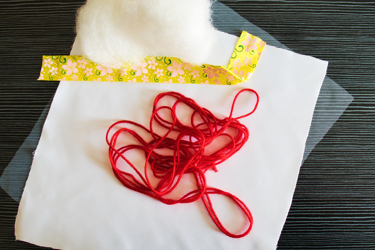 Кладём лоскуток изнанкой вверх и в центр помещаем кусочек ваты или синтепона. Вата – каноничный натуральный материал, но синтепон лучше держит форму, так что выбор за вами.