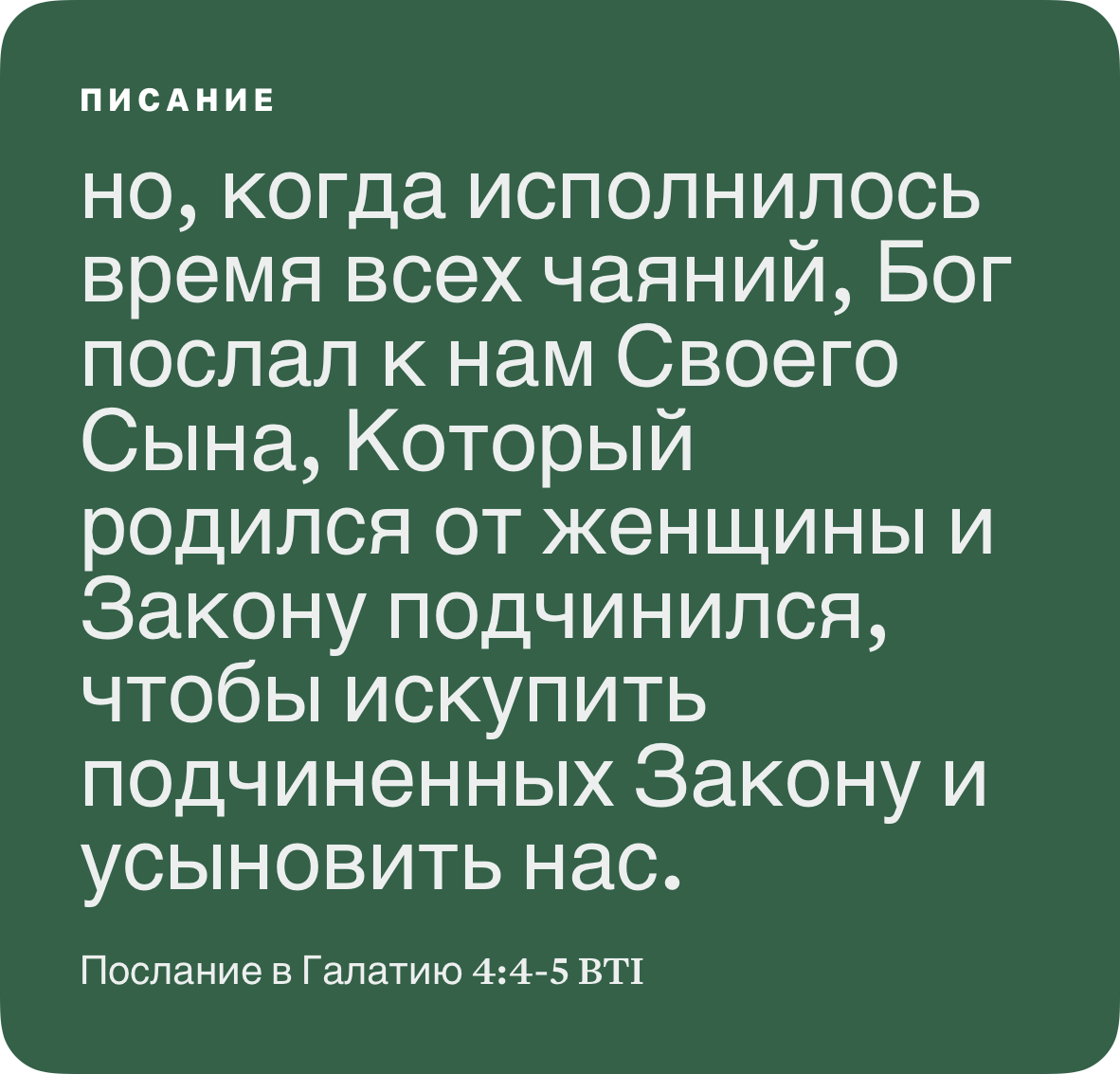В Послании к Галатам 4:4-5 говорится: "Но когда пришло назначенное время, Бог послал Своего Сына, рожденного от женщины, подвластного Закону, чтобы искупить находящихся под Законом и усыновить нас." "Но когда пришло назначенное время…" Тщательно созданный, точно подготовленный. Божий план был реализован до последней детали. Когда настал момент рождения Мессии, это не было ни неожиданностью, ни случайностью. Это было как раз вовремя. Это был один священный момент, когда все творение могло наконец выдохнуть: "Наконец-то". "Бог послал Сына Своего, рожденного от женщины…" Сын Божий покинул Небеса, чтобы родиться. Что может быть более скромным актом жертвоприношения? Он принял человеческий облик и прожил Свою жизнь здесь, на земле. "Подвластного Закону, чтобы искупить находящихся под Законом …" Имеется в виду Закон Моисеев. Закон Моисея определяется в Ветхом Завете строгими требованиями и стандартами Божьего совершенства – стандартами, которым люди в одиночку никогда не смогут соотве