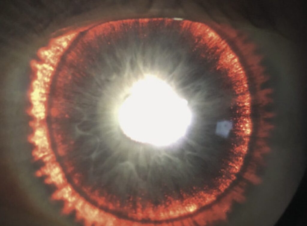 «Патология вызвана отслоением пигментных клеток радужки, которые свободно перемещаются во внутриглазной жидкости. Визуальный эффект поразительный – темный центр окружен ярким оранжевым ореолом, создавая поистине мистическое зрелище», – поясняет профессор Стенхаммер.