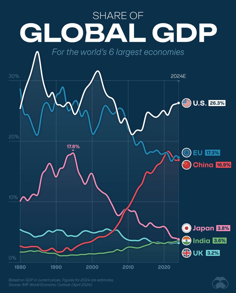 ТОП-6 крупнейших экономик мира по ВВП в динамике с 1980 года