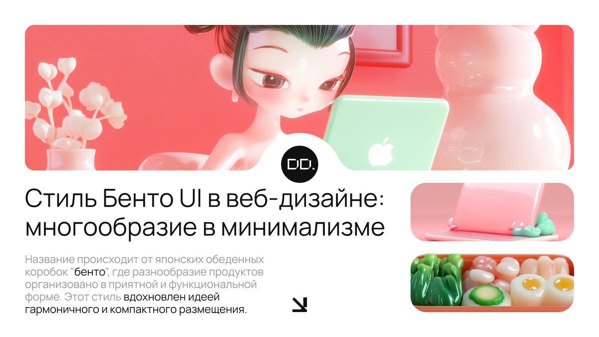 Бенто UI — относительно новый и быстро нарастающий стиль в веб-дизайне, привносящий свежий взгляд на организацию и презентацию контента. Название происходит от японских обеденных коробок "бенто", где разнообразие продуктов организовано в эстетически приятной и функциональной форме. Этот стиль вдохновлен идеей гармоничного и компактного размещения, когда каждый элемент имеет свое место и значение. Давайте подробнее рассмотрим, что делает стиль Бенто UI уникальным, и как его можно применять в веб-дизайне. Бенто UI берет свое начало из концепции минимализма и функциональности, интегрируя идеи, близкие к японской культуре внимательности к деталям и упорядоченности. В бенто-обедах разнообразие содержимого сочетается с компактностью упаковки, что отражает суть этого стиля в веб-дизайне: представление большого объема информации в компактной, удобной и эстетически приятной форме. 1. Компактные блоки контента: Элементы отображаются в виде блоков разного размера и формы, которые могут компактно