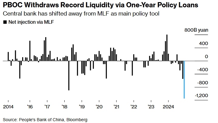 Народный банк Китая изъял 1,15 трлн юаней через многоцелевой фонд в декабре. Citic Securities видит возможность для Народного банка Китая снизить ставку В начале этого года НБК начал снижать процентные ставки, чтобы стимулировать экономический рост. Однако в последнее время он воздерживается от дальнейшего смягчения денежно-кредитной политики. В марте НБК не стал снижать процентные ставки, несмотря на ожидания аналитиков. Вместо этого он изъял ликвидность из финансовой системы, используя инструмент однолетних кредитов. Это было сделано для поддержания стабильности на рынке и предотвращения возможных колебаний. В то же время НБК не стал объявлять о каких-либо конкретных мерах поддержки экономики. Это связано с ожиданием реакции США на торговые споры между двумя странами. Источник: Народный банк Китая, BloombergНародный банк Китая изымает рекордную ликвидность посредством однолетних контрактов. Центральный банк отошел от МФ как основного инструмента политики В марте НБК изъял рекордную с
