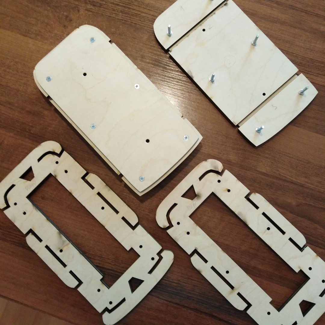 Не знаю насколько оптимальным был именно такой конструктив, но ничего лучше я придумать не смог. Сил и времени на поиски подобных решений всегда уходит немало. Хорошо, когда идешь какой-то проторенной дорожкой и можно поступить по аналогии с той или иной игрушкой. Но, к сожалению, так бывает не всегда и приходится ломать голову. Для сборки фанерных деталей между собой я использовал столярный клей ПВА и всякие гаечки-винтики там, где это было возможно. Под оси колес я заранее подготовил пазы, в которые они и легли, когда я собирал вместе весь «бутерброд». Длинные винтики М5 позволили мне надежно стянуть воедино дно, бампер-ступеньки и основание кузова Автомобиля. Весь этот подготовительный процесс довольно долгий, т.к. прежде чем переходить к очередному этапу, требовалось дождаться пока все основательно высохнет. Если начать работать раньше, особенно с поролоном, то можно было получить нежелательные локальные замятия, там где случайно образовался небольшой излишек клея. Колеса и колпаки