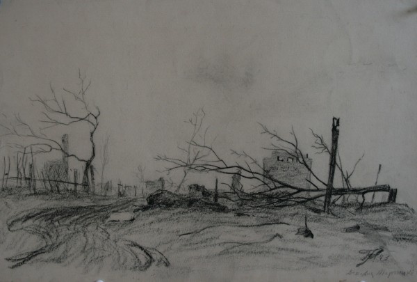 Уголь, смешанный с мокрым снегом, Как рисунок карандашом. Мы зашли, и за нами следом Основной отряд подошёл. Мы оформили всё, как надо. На намеченной высоте Под торжественный марш отряда Флаг гвардейский алый взлетел. И пейзаж уж не чёрно-белый. Совершенно иной пейзаж. Вдохновенный. Живой. Победный. Величавый. Свободный. Наш. Б. М. Неменский «Прифронтовая деревня». 1943 г. Нижнетагильский музей изобразительных искусств