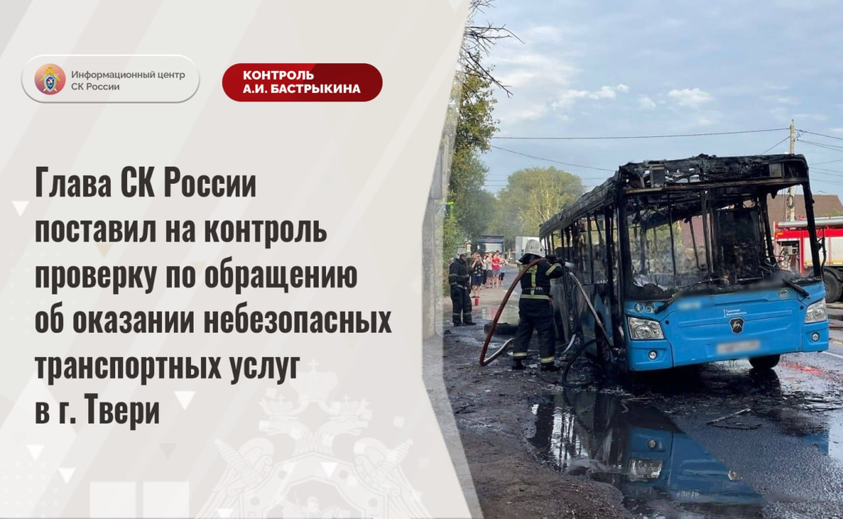 Глава СК России поставил на контроль проверку по обращению об оказании небезопасных транспортных услуг в г. Твери К Председателю СК России А.И. Бастрыкину через аккаунт Информационного центра «ВКонтакте» обратилась жительница Тверской области, направив ссылку на публикацию в социальной сети об оказании небезопасных транспортных услуг. В городе Твери на маршруты выпускаются автобусы в технически неисправном состоянии. Так, в сентябре текущего года на улице 26 июня полностью выгорел пассажирский транспорт, обошлось без пострадавших. Отмечается, что данный инцидент не единичен, однако компетентными службами мер к разрешению проблемы не принимается. В СУ СК России по Тверской области по доводам комментария начата процессуальная проверка. Председатель Следственного комитета Российской Федерации Александр Иванович Бастрыкин поставил ход процессуальной проверки на контроль в центральном аппарате ведомства и поручил руководителю СУ СК России по Тверской области Альберту Андреевичу Кизимову пре
