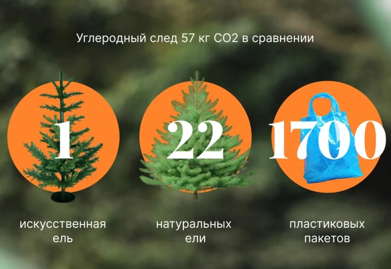 Большинство искусственных ёлок привозят в Россию из-за границы. Производство и доставка таких ёлок требуют огромных затрат энергии. Для примера углеродный след искусственной импортной ели, купленной в Москве, — около 57 кг СО2. Столько же оставляет 10-летний запас пластиковых пакетов в пересчёте на одного россиянина. При этом живая ель оставляет в 22 (!) раза меньше углеродного следа — 2,6 кг СО2.