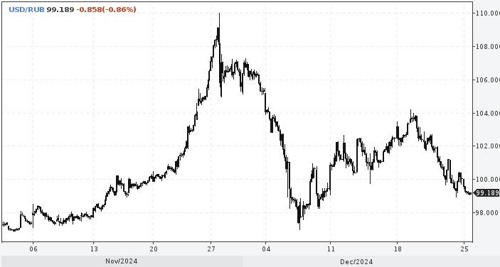 Аналитики Freedom отмечают, что регулируемый практически в ручном режиме валютный курс в начале 2025 г. будет возле 100, но затем продолжит расти до 110 рублей за доллар. Курс доллара к рублю расчётный, фьючерс, вечный фьючерс и межбанк. Курс евро к рублю расчётный, фьючерс, вечный фьючерс и межбанк. Курс юаня к рублю биржевой, фьючерс, вечный фьючерс и межбанк. После завершения налогового периода пара USD/RUB закрепится у отметки 100 руб./$1, полагает аналитик Freedom Finance Global Владимир Чернов. «Рубль укрепляется на фоне налогового периода, в течение которого экспортеры продают валютную выручку, усиливая спрос на рубли, — пишет эксперт. — 25 декабря, на пике указанного периода, выплачивается налог на прибыль организаций, НДПИ, а также перечисляются страховые взносы на обязательное социальное, пенсионное и медицинское страхование, акцизы, налог на игорный бизнес и единый налоговый платеж. Основную поддержку рублю оказывает стабилизация ситуации с оплатами экспорта российского газа