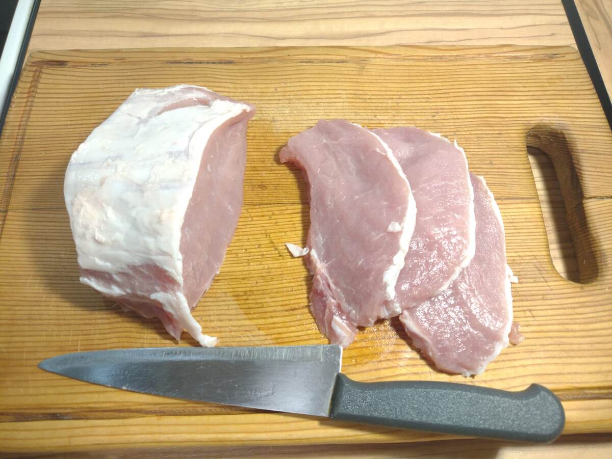 Для начала нам понадобится свиная корейка, у меня есть кусок весом примерно 700 граммов, который нужно нарезать на отбивные. В качестве альтернативы можно использовать курицу, например, куриные грудки или бедра, а также другие части свинины, такие как вырезка или лопатка. На мой взгляд, готовить это блюдо из говядины не стоит, так как вкус может не удовлетворить. Теперь отбиваем мясо, чтобы кусочки стали тонкими. Каждый из них необходимо посолить, поперчить и приправить специями. У меня есть готовая смесь специй для свинины, которой я посыплю мясо с обеих сторон и оставлю на время. В отдельной миске разбиваем два крупных яйца, добавляем одну столовую ложку майонеза с хорошей горкой. Если вы предпочитаете, можно заменить майонез сметаной или добавить чайную ложку горчицы по вкусу. Все тщательно перемешиваем до получения однородной массы. Далее нам понадобится два крупных картофеля, а если они среднего размера, то лучше взять три. Очищаем их и натираем на мелкой терке, затем помещаем в