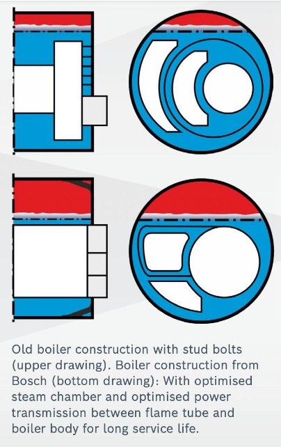 «Котел старой конструкции со шпильками (верхний рисунок). Котел конструкции от Bosch (нижний рисунок): с оптимизированной паровой камерой и улучшенной передачей мощности между дымогарными трубами и телом котла для долгой службы».
