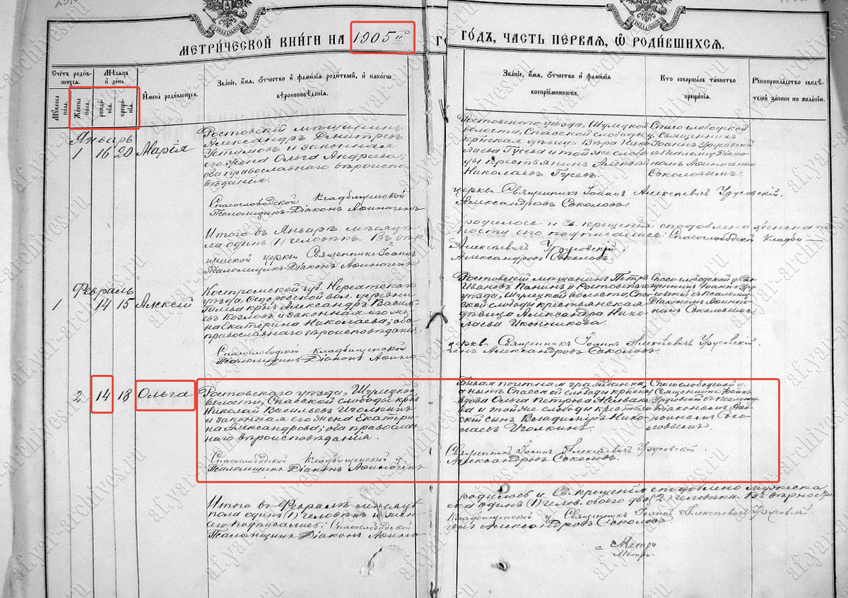 Как читается метрика: 14 (рождение, старый стиль) , 18 (крещение) февраля 1905 года . Ольга. Родители: Ростовского уезда, Шулецкой волости, Спасской слободы крестьянин Николай Васильев Иголкин и законная его жена Екатерина Александровна, оба православного вероисповедания. Восприемники (крестные) Бывшая почетная гражданка, а ныне Спасской слободы крестьянская вдова Ольга Петровна Желвакова. И той же слободы крестьянский сын Владимир Николаевич Иголкин.