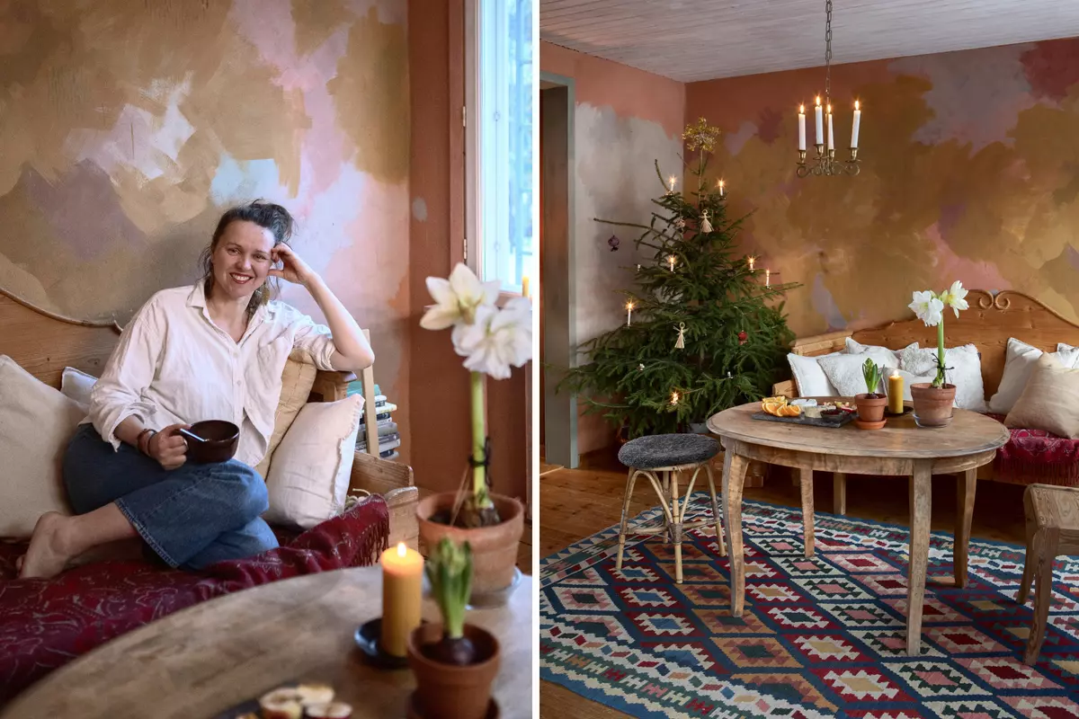 Снег укрыл двор старого дома в Наантали, и, кажется, само время остановилось. Здесь, среди ароматов выпечки и легкого треска свечей, живет Сувека Кюмяляйнен с двумя сыновьями. Их дом — это не просто место, где проводят праздники. Это живая история, сотканная из семейных традиций, находок с блошиных рынков и любви к природным материалам. Дом с душой Семейное гнездо Кюмяляйнен — это дом, построенный в 1953 году. Все в нем дышит эпохой: деревянные полы, старинные двери, которые Сувека решила сохранить, и мебель с богатым прошлым. Здесь на стенах цветут обои Уильяма Морриса, а также светятся фонари, найденные хозяйкой на рынках. "Я не люблю белые стены", — признается Сувека, проводя рукой по винтажным обоям. Она с улыбкой добавляет, что обожает теплые, природные оттенки. Так, стены в гостиной покрыты смесью, сделанной по ее авторскому рецепту из глины, а для акцента используется старая винная краска. Елка с характером Особая гордость семьи — рождественская елка. Но не думайте, что это пышн