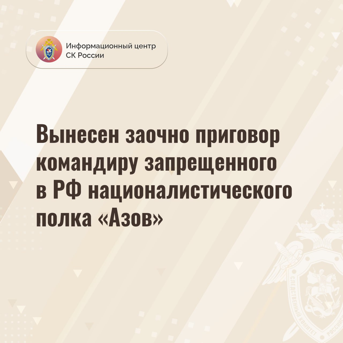 Вынесен заочно приговор командиру запрещенного в РФ националистического полка «Азов» На основании доказательств, собранных Следственным комитетом России, Верховным Судом Донецкой Народной Республики вынесен заочно приговор командиру войсковой части 3057 национальной гвардии Украины (запрещенный на территории Российской Федерации националистический полк «Азов») подполковнику Денису Прокопенко. Он признан виновным в покушении на убийство двух и более лиц, совершенном группой лиц, общеопасным способом, по мотивам идеологической и политической ненависти (ч. 3 ст. 30 пп. «а», «е», «ж» и «л» ч. 2 ст. 105 УК РФ); жестоком обращении с гражданским населением, применении в вооруженном конфликте запрещенных средств и методов (ч. 1 ст. 356 УК РФ); умышленном повреждении чужого имущества, повлекшем причинение значительного ущерба (ч. 2 ст. 167 УК РФ). Следствием и судом установлено, что в период с 17 по 25 марта 2022 года Прокопенко, находясь на территории металлургического комбината «Азовсталь» в
