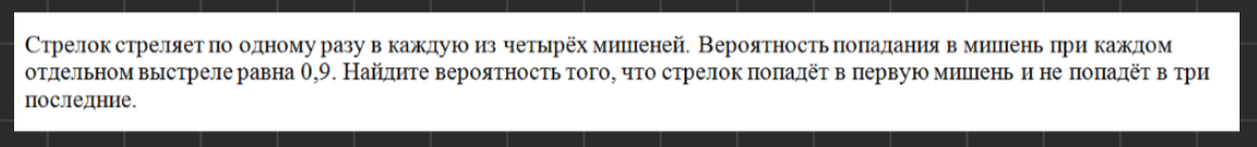 Стрелок стреляет по одному разу в каждую из четырёх мишеней. Вероятность попадания в мишень при каждом отдельном выстреле равна 0,9. Найдите вероятность того, что стрелок попадёт в первую мишень и не попадёт в три последние. В Профильном ЕГЭ по математике есть простая вероятность и есть вероятность поинтересней. Составители КИМов заверяют, что сложностей типа схем Бернулли не будет, а будут задания с интересными нюансами. В этой статье разберём САМУЮ простую задачу под этим номеров в экзамене. Вероятность промаха находим, отнимая вероятность попадания от единицы. Так как у нас два возможных исхода по одной мишени, а мишеней четыре, то имеем 16 возможных исходов. Вероятность каждого исхода находится умножением. И все они в сумме дают единицу. Но нам каждую находить не нужно. Попадет в первую и не попадёт в три последние, находим перемножая соответственные величины. Не удивляйтесь, что среди интересной вероятности есть такая легкая задача! Не нужно искать никаких подвохов! Спокойно пер