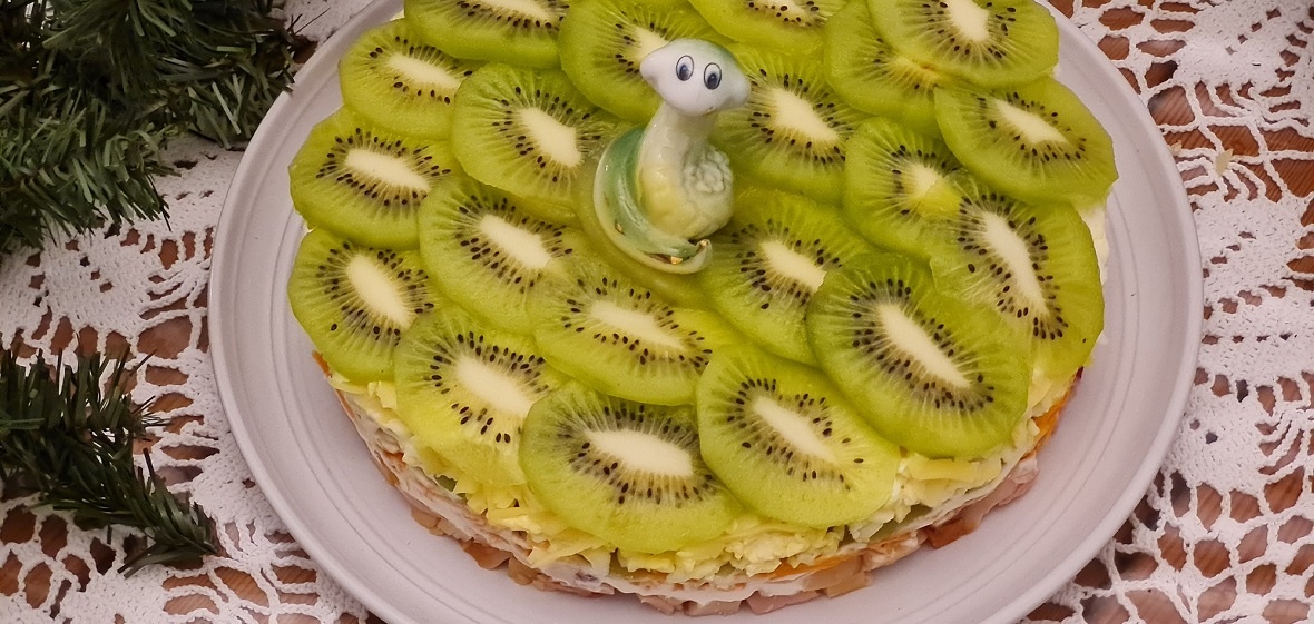 Китайский гороскоп прочно вошёл в нашу жизнь. Поэтому предлагаю актуальный салат, который отвечает всем требованиям к набору блюд на новогоднем столе 2025 года. При этом он вкусный и красивый. Подготовим продукты: — курица копчёная 300 граммов — (2 окорочка примерно); — морковь по-корейски — 200 граммов; — киви — 5 штук; — сыр полутвердый типа «Голландского» — 130 граммов; — яйца — 4 штуки; — майонез — на каждый слой, кроме киви, примерно по 2 столовых ложки; — соль и перец не нужны, так как в ингредиентах их достаточно. Чтобы салат получился красивый, лучше использовать кольцо от формы для торта. Поставьте его на тарелку или блюдо и начинайте выкладывать слоями. Первый слой — нарезанная кубиком копчёная курица. Курицу смажьте майонезом. Выложите морковь по-корейски. Её можно купить готовую, а можно приготовить самостоятельно. Это несложно. Теперь смазываем майонезом морковь и выкладываем пластики киви. Майонезом этот слой смазывать не нужно. Я все киви нарезаю сразу. Ровные пластики о