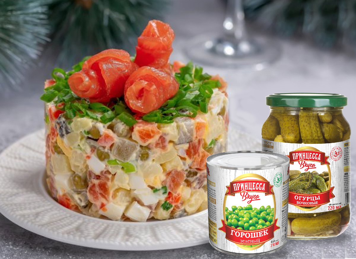 Вам понадобятся: 100 г филе слабосоленой красной рыбы, 100 г филе слабосоленой сельди, 100 г консервированного или размороженного зеленого горошка, 100 г отварного картофеля, 100 г отварной моркови, 4 отварных яйца, зеленый лук и майонез по вкусу, красная рыба для украшения салата. Приготовление. Филе нарежьте небольшими кусочками, а картофель и морковь – кубиками. Яйца натрите на крупной терке или пропустите через яйцерезку. Зеленый лук мелко нарежьте. Сложите все перечисленные компоненты в глубокую емкость и добавьте туда же горошек. Заправьте массу майонезом и перемешайте салат. Посуду с салатом достаньте из холодильника. На плоское блюдо поместите формовочное кольцо и выложите туда салат. Немного утрамбуйте его и разровняйте поверхность. Затем кольцо снимите, а салат украсьте кусочками красной рыбы и мелко нарезанным зеленым луком.