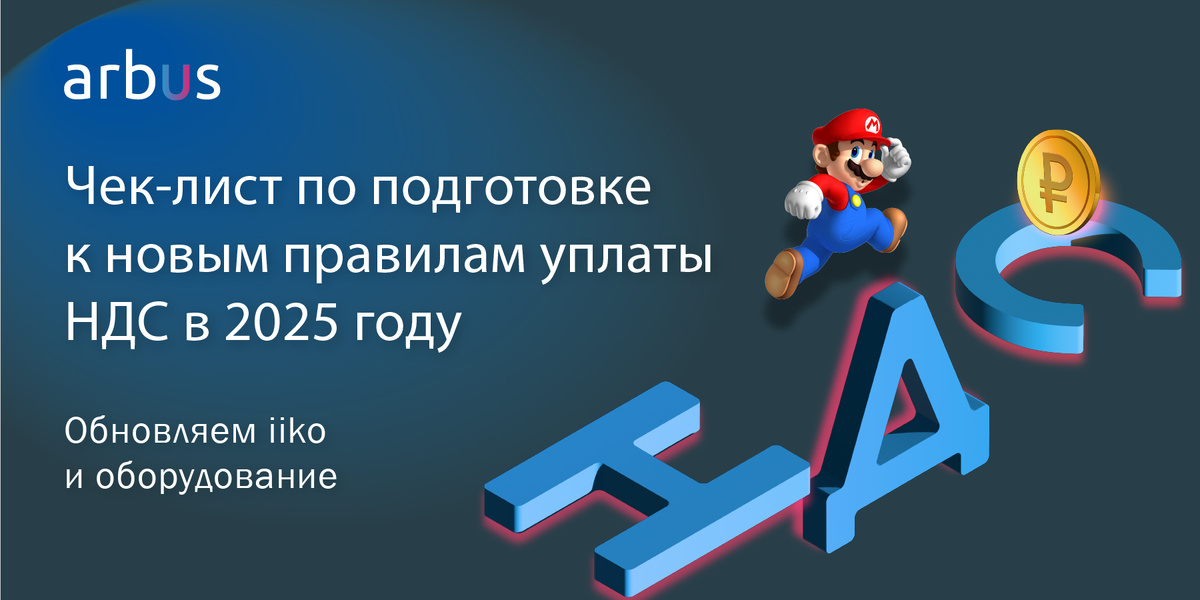 Прямо с наступлением нового 2025 года многие организации и ИП, применяющие упрощенную систему налогообложения, признаются плательщиками НДС: Официальная публикация закона Новость на сайте ФНС Вводятся новые ставки НДС 5% и 7% для организаций и ИП с системой налогообложения УСН, а конкретная ставка НДС зависит от годового дохода. Организации и ИП, оказывающие услуги общественного питания, освобождены от уплаты НДС при одновременном соблюдении ряда условий, согласно ст. НК РФ 149. Мы писали о них ранее в нашем канале, а при сомнениях рекомендуем вам обратиться в ФНС за разъяснениями. Если всё же вы попали под условия уплаты НДС, то необходимо оперативно свериться с нашим чек-листом готовности и ЗАПИСАТЬСЯ НА РАБОТЫ * 8 800-700-76-85 mail@arbus.biz *работы по обновлению и настройке iiko проводятся в порядке записи и при наличии технической возможности, работы по ККТ проводятся в рабочее время сервисного центра ARBUS **для ККТ Штрих/Ритейл нужно проверить индекс исполнения. Должен быть ФМ,