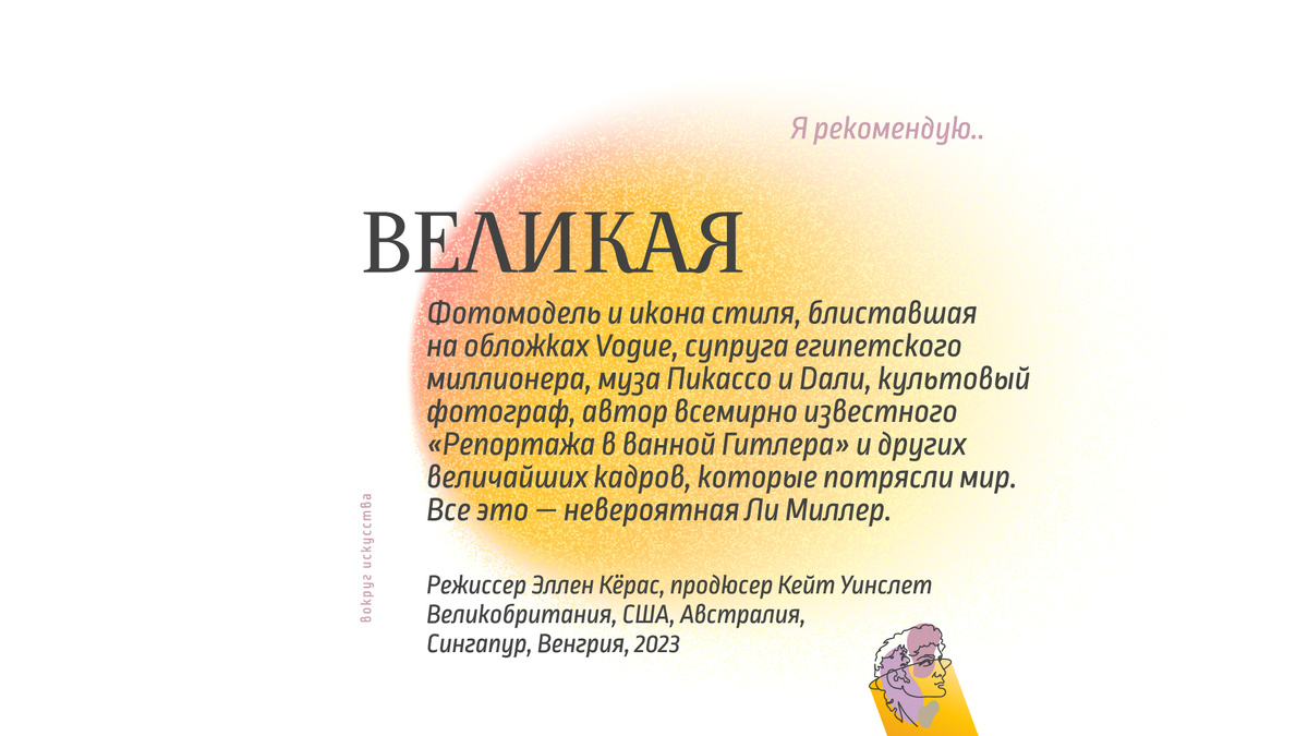 Фильм на реальных событиях о военном фотографе Ли Миллер, которая пыталась показать «лицо войны». Продюсером и исполнительницей главной роли стала Кейт Уинслет. Художник на войне. Являясь журналистом британского Vogue бросается в горячие точки, наблюдая за тем, как вторая мировая изуродовала некогда прекрасные города, а вместе с тем и души людей. С течением времени перед Ли появилась задача во что бы то ни стало всем и каждому показать правду. Правду несправедливых последствий войны, в которой самые неповинные люди искорежили свои жизни или просто потеряли ее. Она против молчания и запретов говорить на такие тяжелые темы, ведь безнаказанность поражает вседозволенность. «Я до сих пор не могу поверить, что мне (больше) не нужно продолжать попытки снять этот фильм. Я так долго пыталась это сделать…