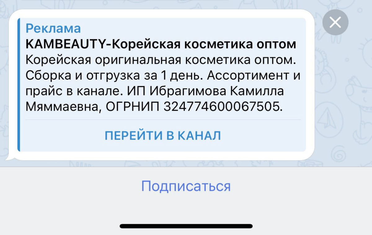 Запрос: К нам обратился оптовый магазин корейской косметики. Клиент хотел увеличить количество подписчиков и привлечь больше потенциальных покупателей через Telegram. Решение: Мы провели анализ целевой аудитории клиента и выбрали наиболее релевантные Telegram-каналы для размещения рекламы. Использовали рекламные форматы с акцентом на преимущества продукции и привлекательные офферы для B2B-аудитории. Настроили таргетинг и оптимизировали объявления на протяжении всей кампании для достижения лучшей стоимости за подписчика. Результат: В результате работы средняя стоимость подписчика составила 164 рубля. По некоторым кампаниям подписчик обходился и в 50 рублей. Но неэффективные кампании повышало среднюю стоимость подписчика. База подписчиков Telegram-канала клиента увеличилась на 914 человек, что привело к росту заявок от новых клиентов на оптовые закупки.