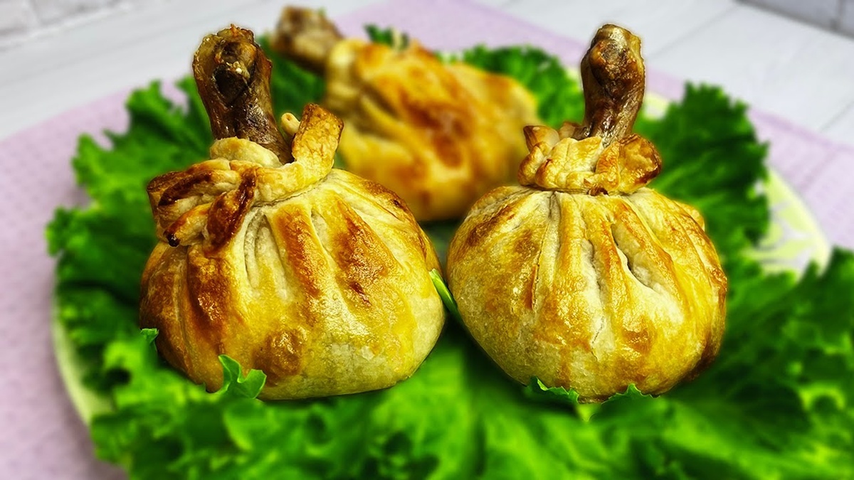 25-30 минут, до золотистого цвета теста. Куриные ножки в "мешочках" с картофелем и грибами готовы. Снять фольгу и можно подавать. Для более красивого оформления подачи "мешочков" можно использовать листья салата. Куриные ножки, приготовленные поэтому рецепту, не только являются полноценным блюдом, но ещё и очень необычно и красиво будут выглядеть на п