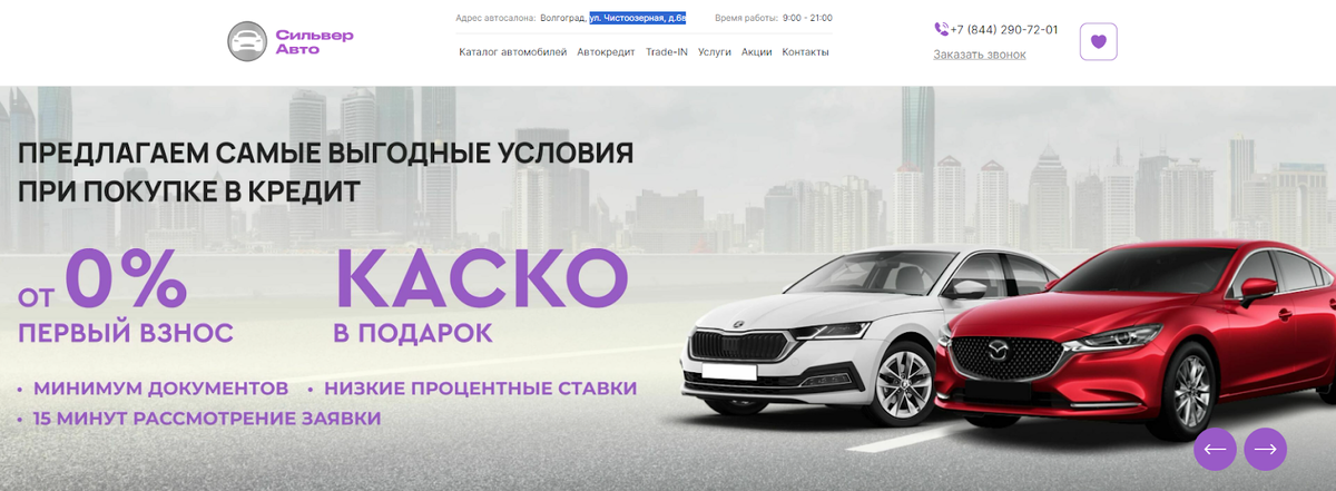 Сильвер Авто — это новый автосалон в Волгограде. Профиля на Я.Картах пока нет. Возможно, он является дублером другого автосалона, а сайт служит для сбора заявок. В сети активно появляются негативные отзывы о нем. Поэтому мы решили проверить этот автосалон. Подробности в нашем обзоре. Автосалон Сильвер Авто находится в Волгограде. Он расположен по адресу: ул. Чистоозерная, д.6в. В футере сайта в качестве владельца указано ООО "АВТО СОЮЗ" (ИНН 3459086640). Компания была зарегистрирована в Волгограде менее года назад — в апреле 2024. Генеральным директором и учредителем является Манегина Дина Андреевна. Релевантного предпринимательского опыта у нее нет. ООО зарегистрировано недавно, поэтому в реестре пока нет судебных исков. Учитывая небольшой возраст компании мы все же не можем отнести этот факт к числу положительных. Сайт автосалона находится по адресу — silvercar-vlg.ru. Домен был зарегистрирован в сентябре 2024 года, то есть всего 3 месяца назад. Мы считаем, что примерно в это время и